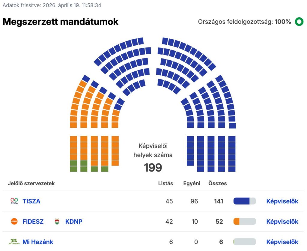 “A TISZA győzött – Magyarország nyert!” – hirdeti honlapjuk. A ma reggel folyamán vált véglegessé a 2026-os országgyűlési választások eredménye. Ennek értelmében megerősítést nyert az, amit már eddig is tudtunk: a Magyar Péter vezette Tisza Párt lehengerlő és országos rekord méretű győzelmet ért el! A FIPESZ-nek (azaz a Fidesznek) pedig ütött az utolsó órája, Vikiegérnek harangoztak.