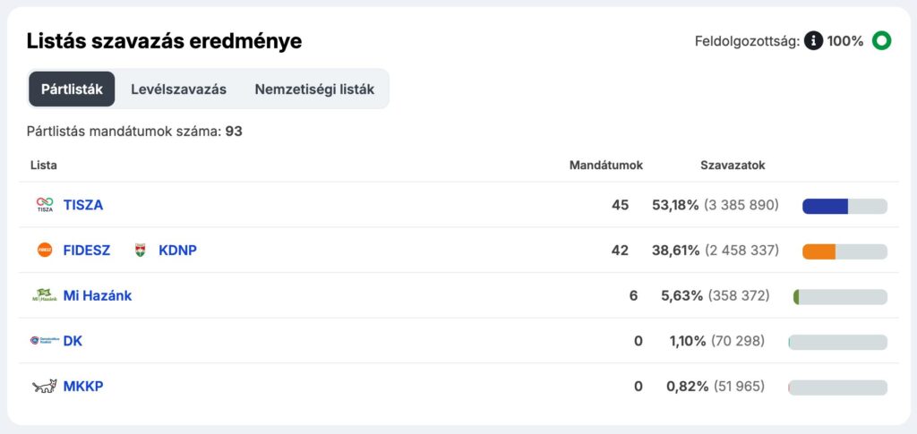 A Magyar Péter elnökletével működő TISZA kiemelkedő, lehengerlő, rekorder győzelme mellett a másik hatalmas pofon és sokk a FIPESZ számára az általuk megszerzett mandátumok száma, amely 8,78%-kal kevesebb (52 db), mint amennyit az ellenzék négy évvel ezelőtt megszerzett (57 db)!